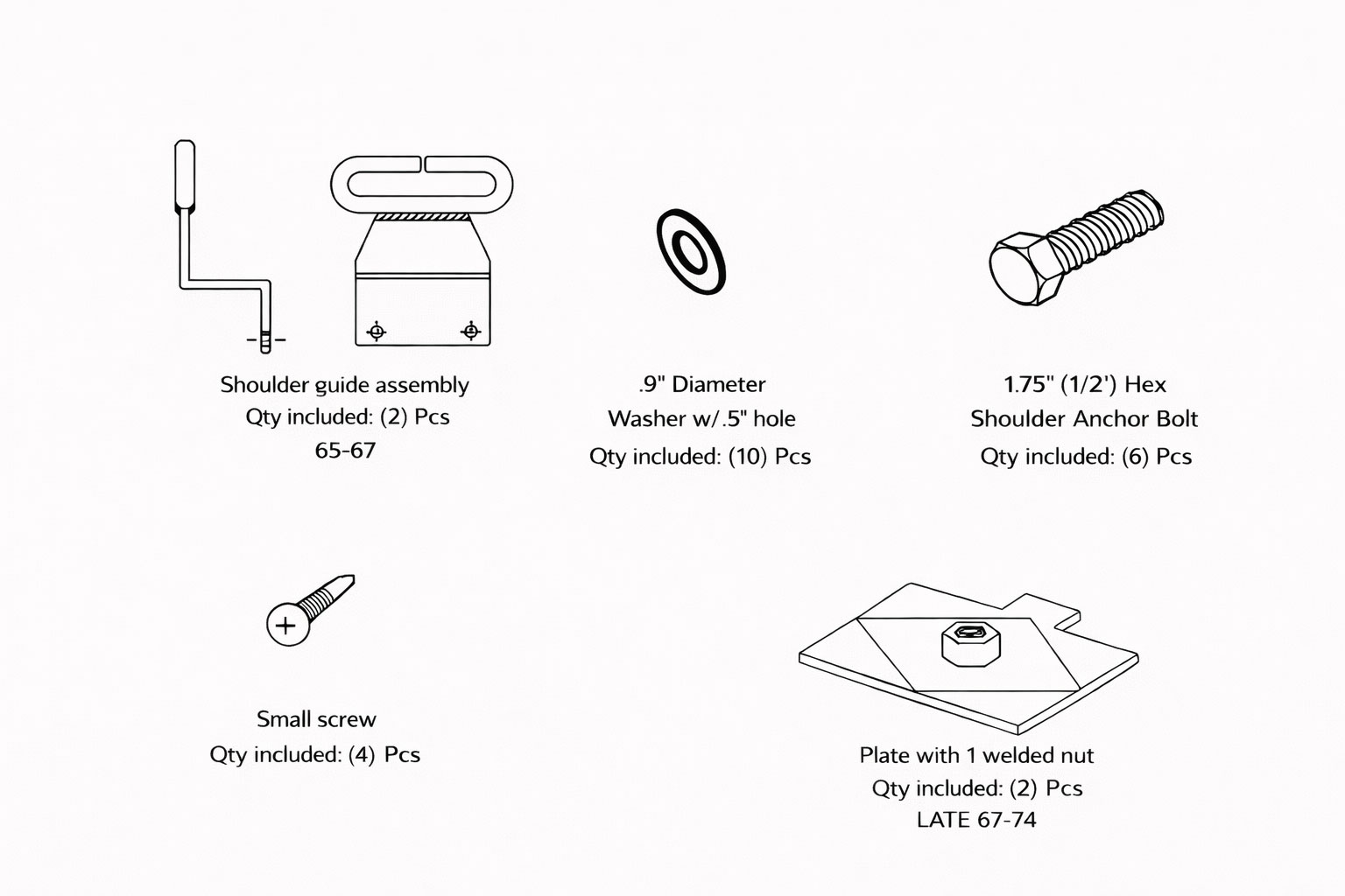 The installation hardware above has been put together to cover as many variations of the '63-'67 Corvette as possible. In many instances, if your vehicle has existing anchor points installed you may not need some of this hardware. Please look over the installation guide for your type of vehicle, feel free to contact us for any questions you have.