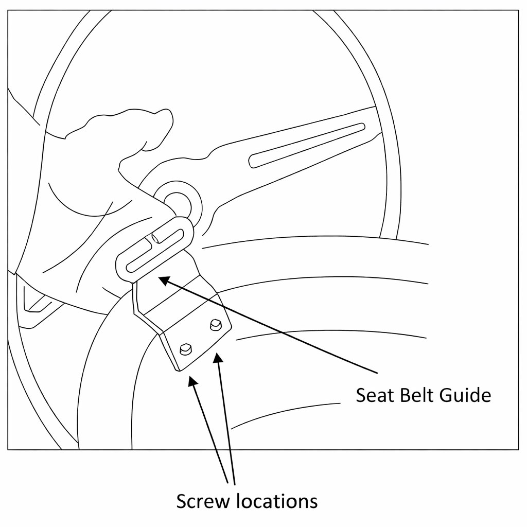 - Using the illustration below, locate the drill points for the seat belt guide. Once you have determined the drill points mark the holes using the openings in the seatbelt guide. Using a hobby knife or a similar cutting tool make a small hole in the center of the mark you made for the holes in the drill guide. This will help to serve as a guide for the screws. The hole made with the hobby knife should be smaller than the diameter of the screw. Once the guide is installed, press the seat back and secure using screws.