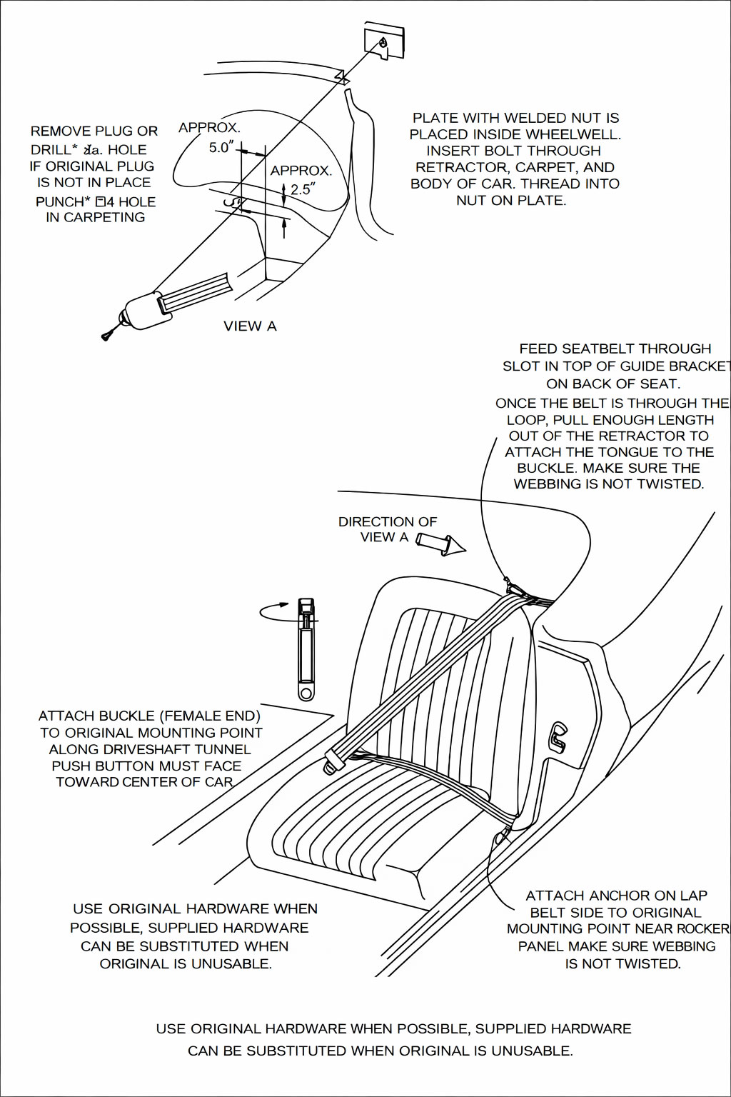 Determine if your installation is a proper fit (no original seatbelts installed) or if you will be replacing existing 2 point belts and can use some of the existing anchor points. (Note: it is important that wherever you can, to use the factory anchor points, if it is determined that you must make your own anchor points, be sure to check behind or below where you will be drilling for adequate clearance for the bolt and reinforcement plate).