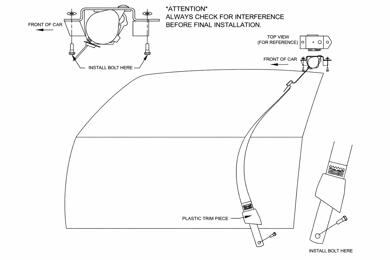 - Assemble retracors and floor anchors without hardware to familiarize yourself with the way the new seat belt installs in your car.