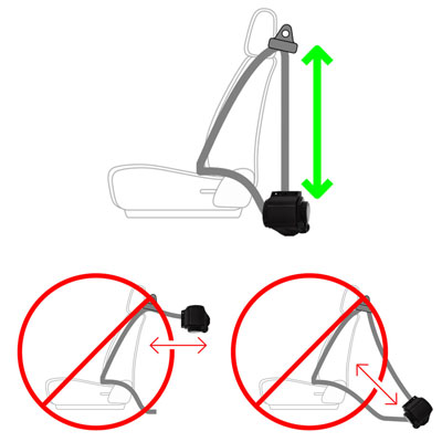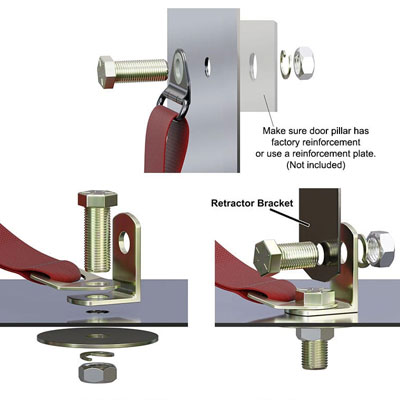 - Do not mount retractor on ceiling, body quarter panels, inside seats, attached behind seat, or feeding through seats.